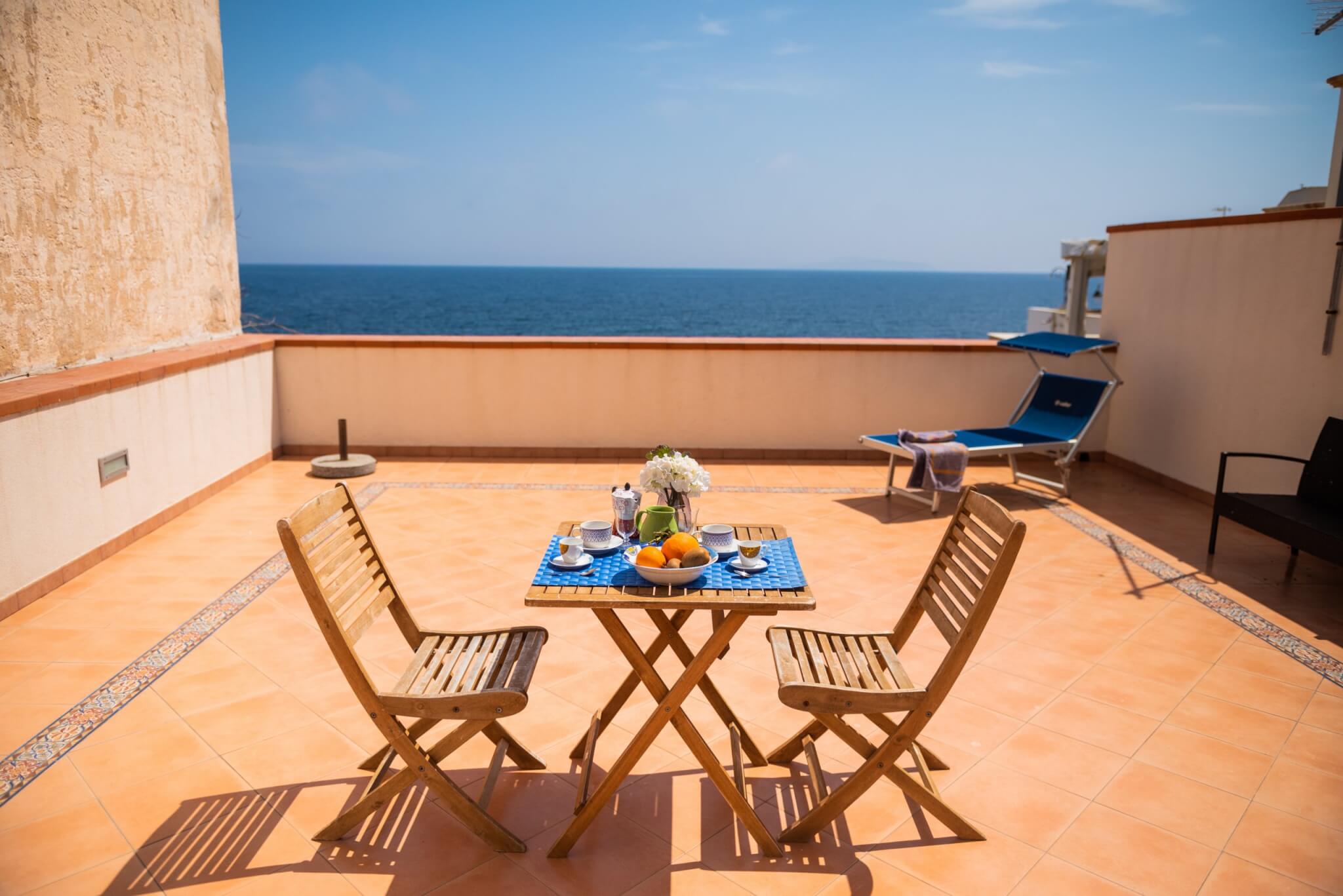 Il valore aggiunto di questa casa è la splendida e spaziosa terrazza attrezzata con vista mare, da cui si può ammirare lo spettacolo delle isole di Favignana e Levanzo, ideale per godersi le albe più suggestive. La zona notte, più interna, è arredata con un comodo letto matrimoniale, comodini e armadio, e il bagno si trova di fronte alla zona letto. È possibile aggiungere fino a due letti supplementari.