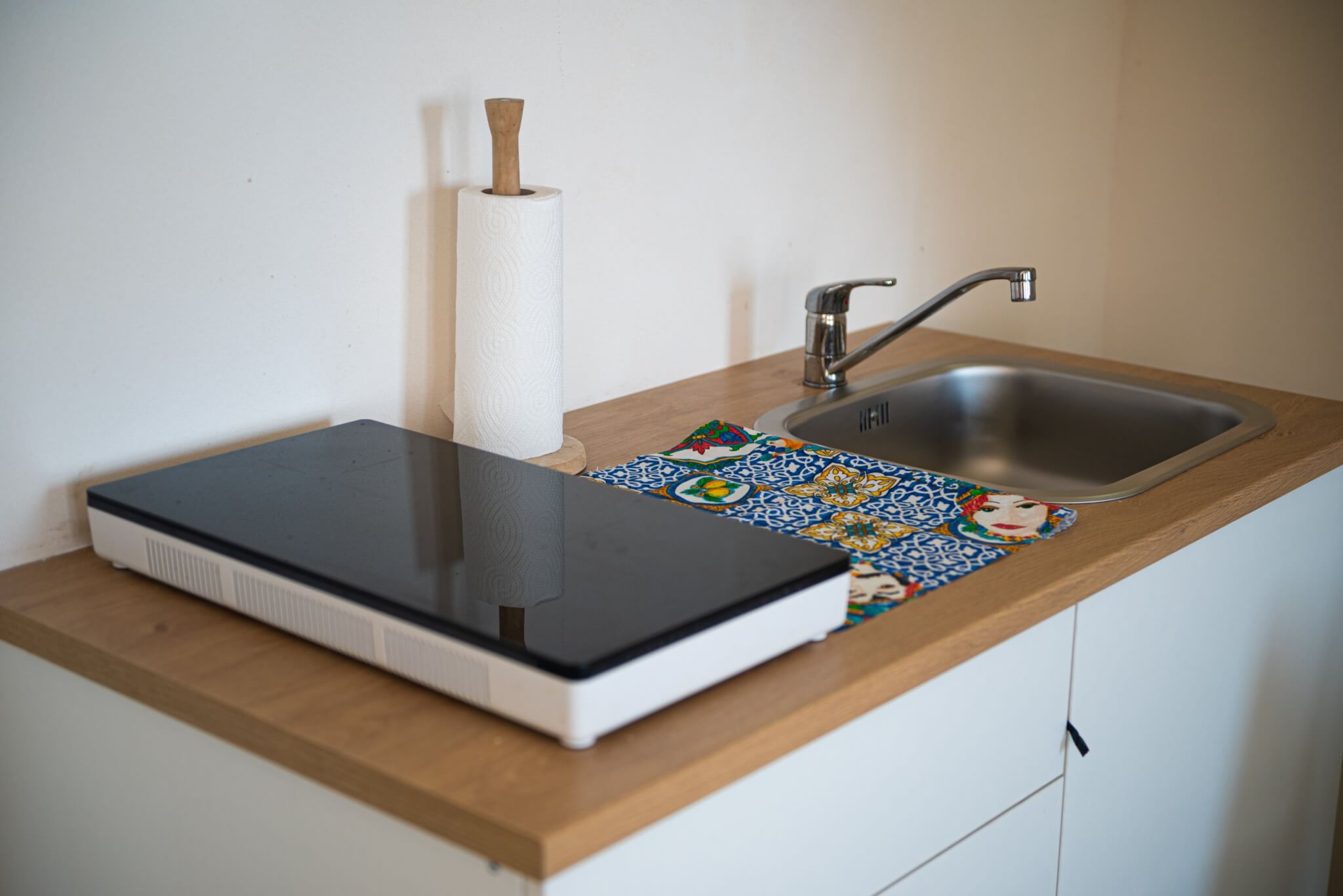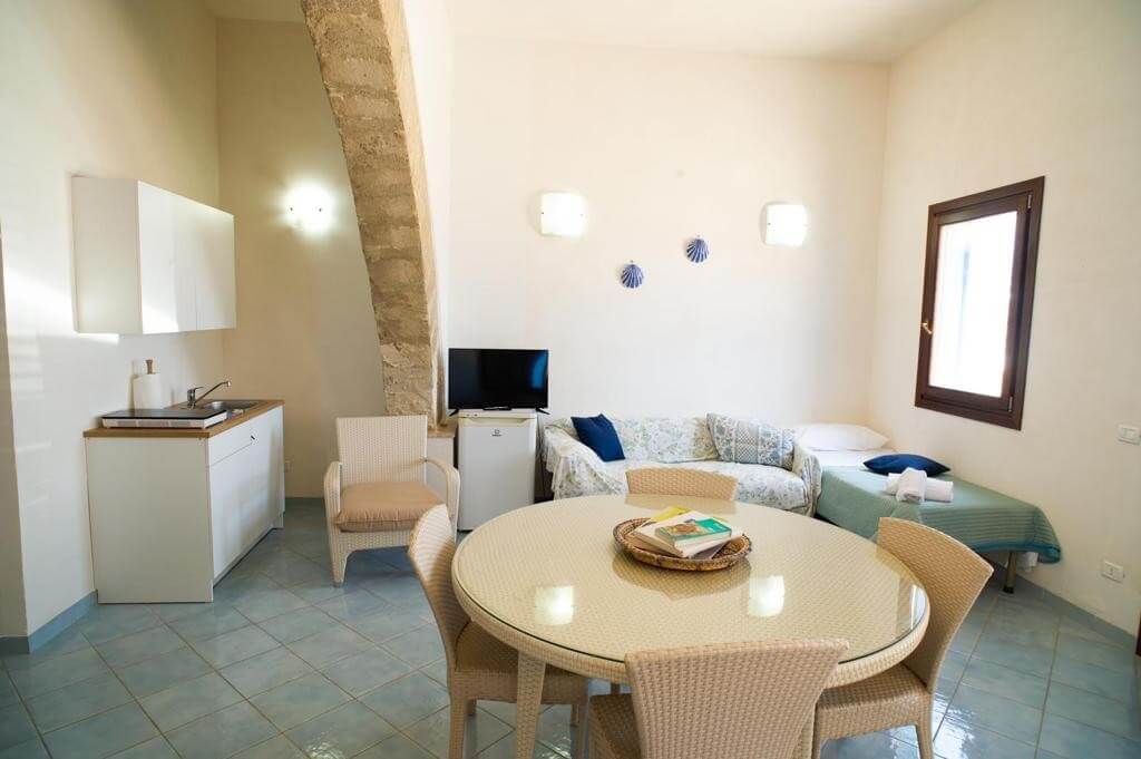 La Casa del Sole è un luminoso monolocale open space in stile mediterraneo, caratterizzato da un grande arco che richiama l’architettura delle antiche costruzioni di chiese e magazzini. L’appartamento, situato al piano terra con accesso indipendente, dispone di un angolo cottura attrezzato con piastra a induzione a due fuochi, stoviglie, posate, piatti, bicchieri, tostapane e caffettiera.