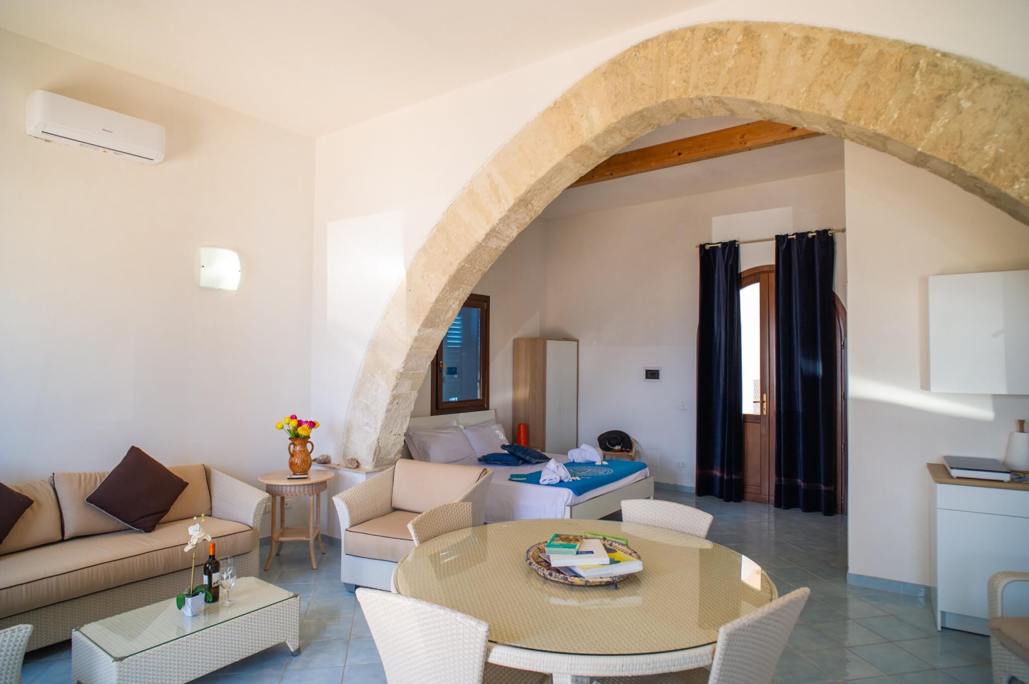 L’area living è arredata con due divani, un grande tavolo, sedie e TV. La connessione Wi-Fi è disponibile tramite modem. Le ampie finestre e porte d’ingresso permettono di godere della vista sul mare, visibile anche attraverso le caratteristiche persiane blu siciliane, un ricordo delle numerose dominazioni che hanno segnato la storia dell’isola.